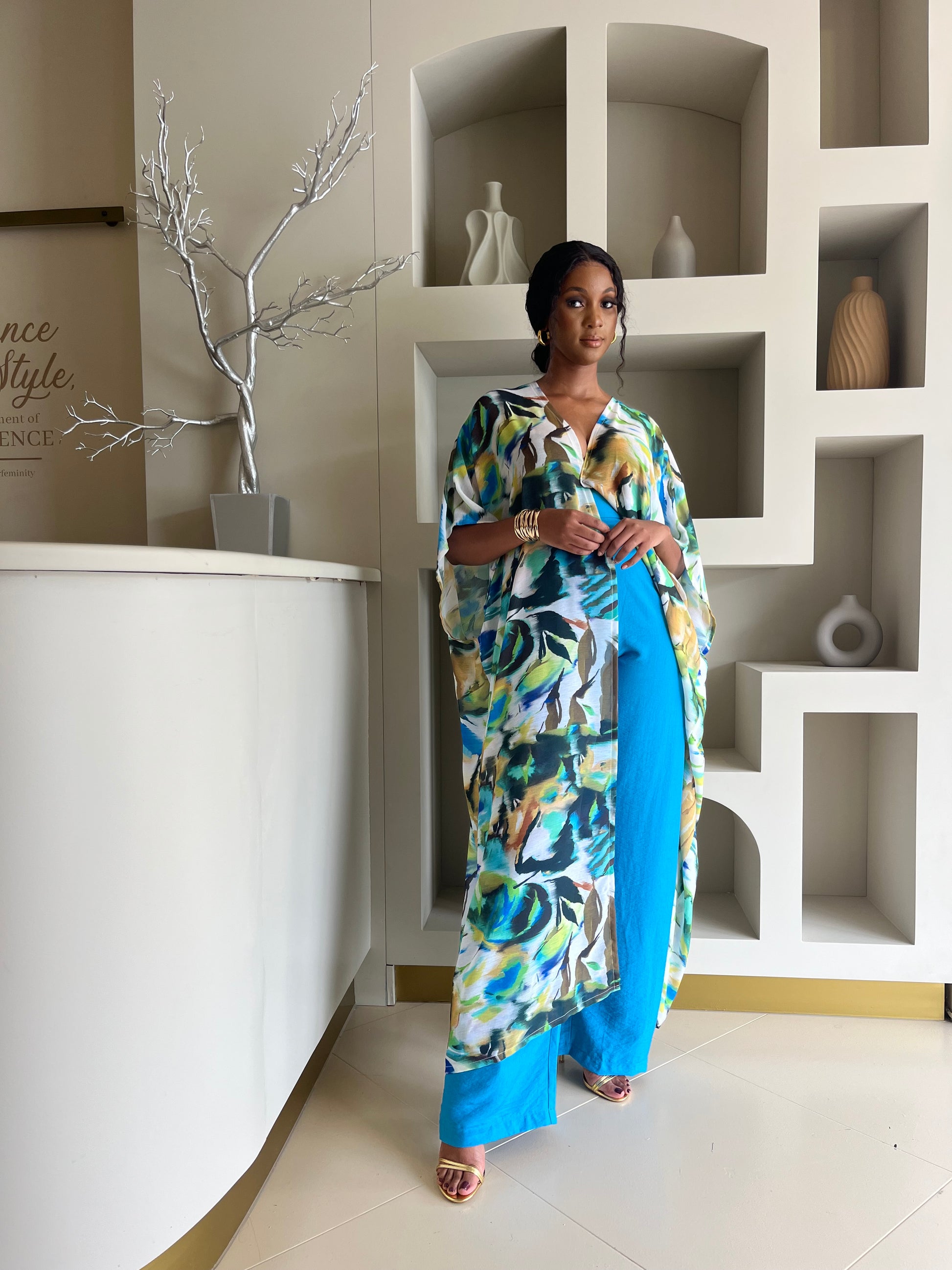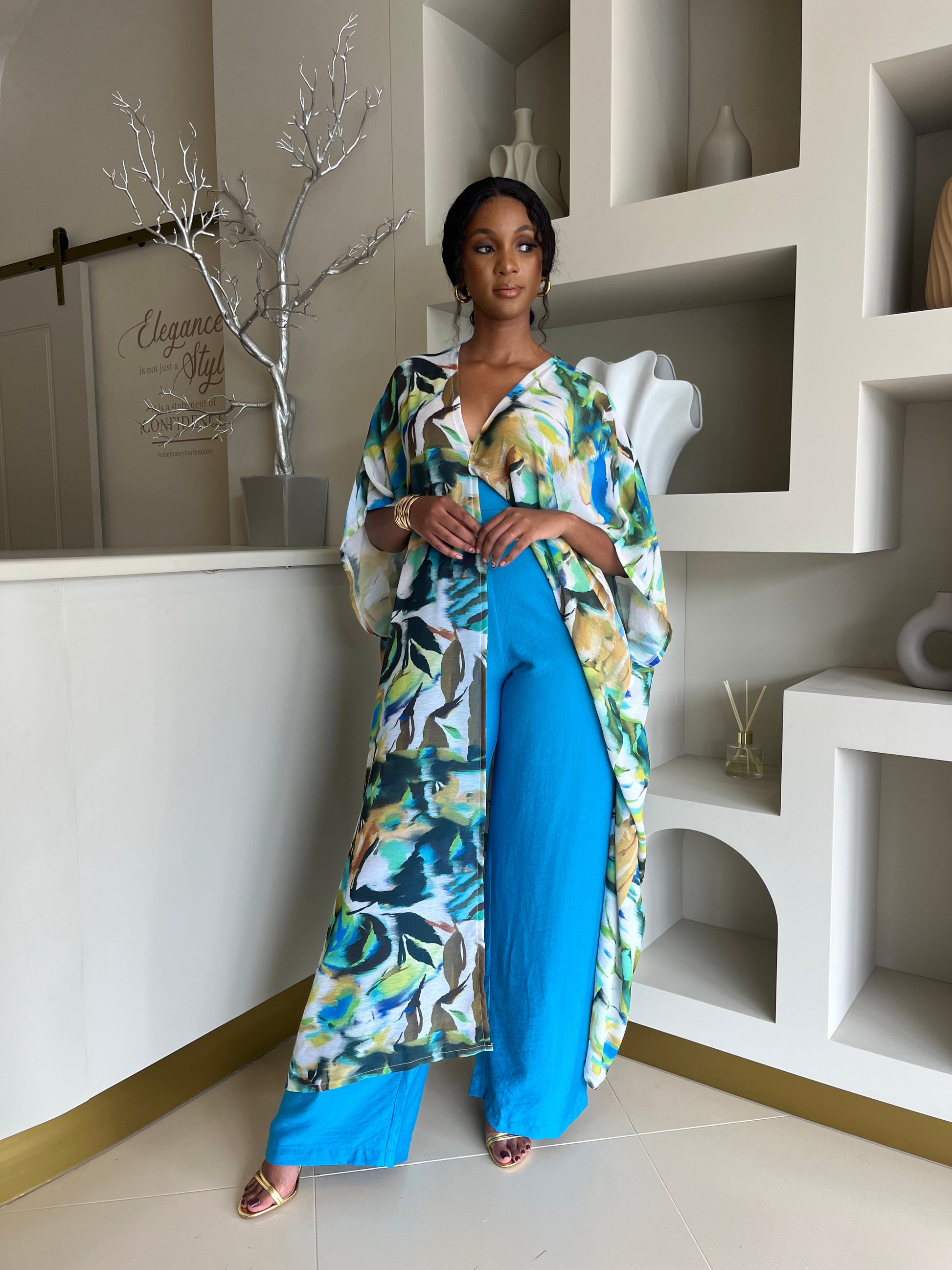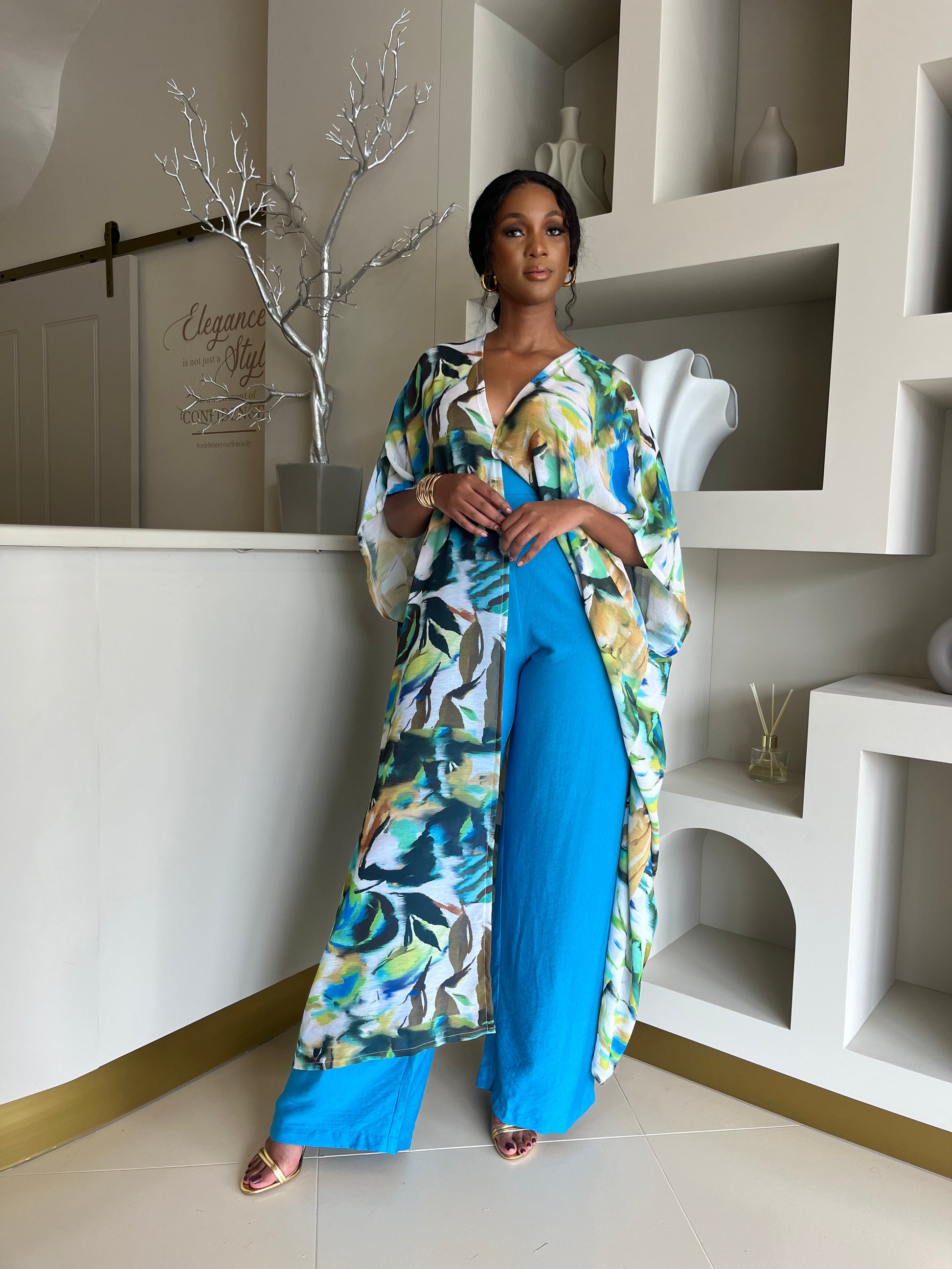 Make a statement with our chiffon Zanzibar set. The elegant kimono features a beautiful floral print, while the high waisted pants elongate your legs. Perfect for adding a touch of sophistication to any outfit.