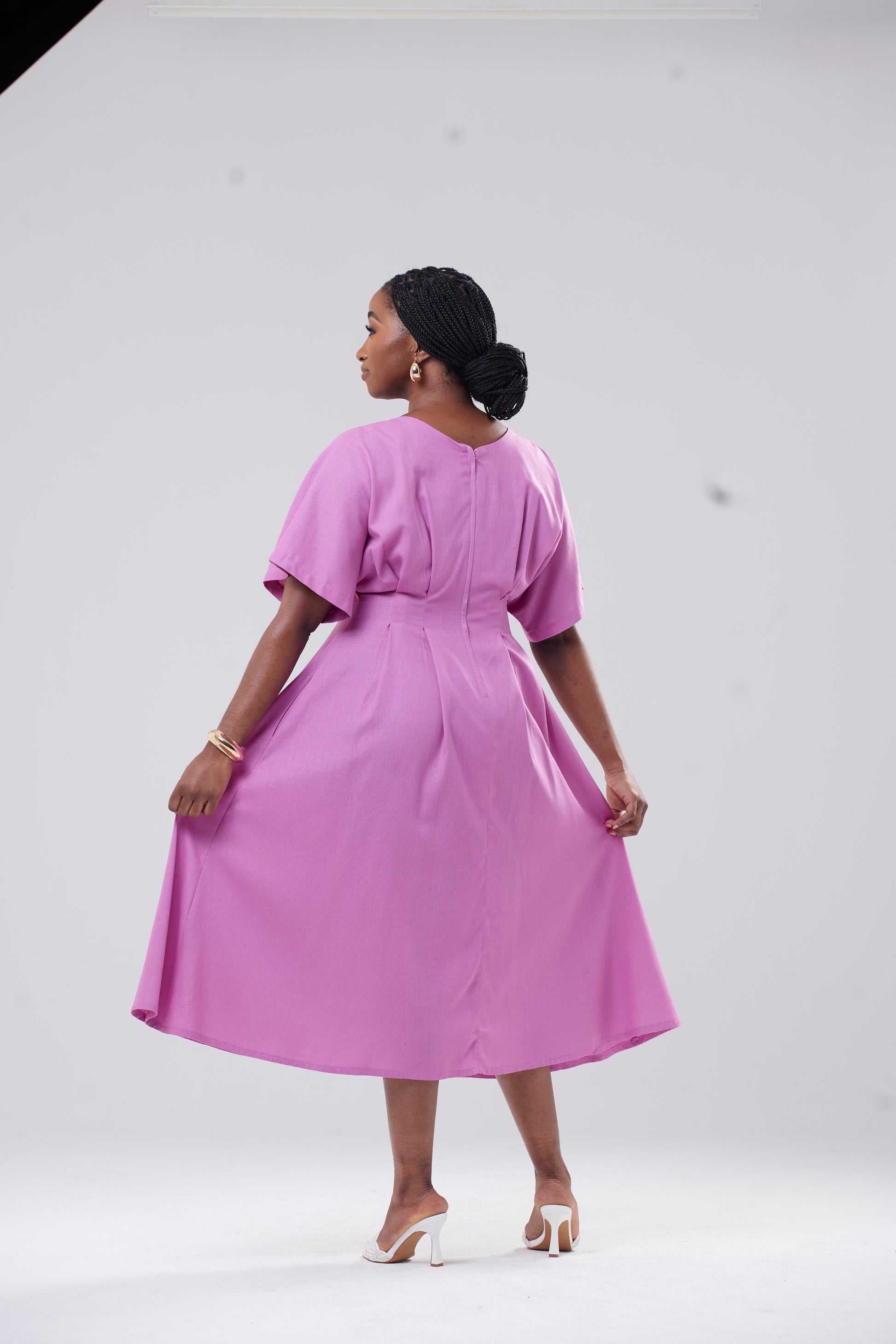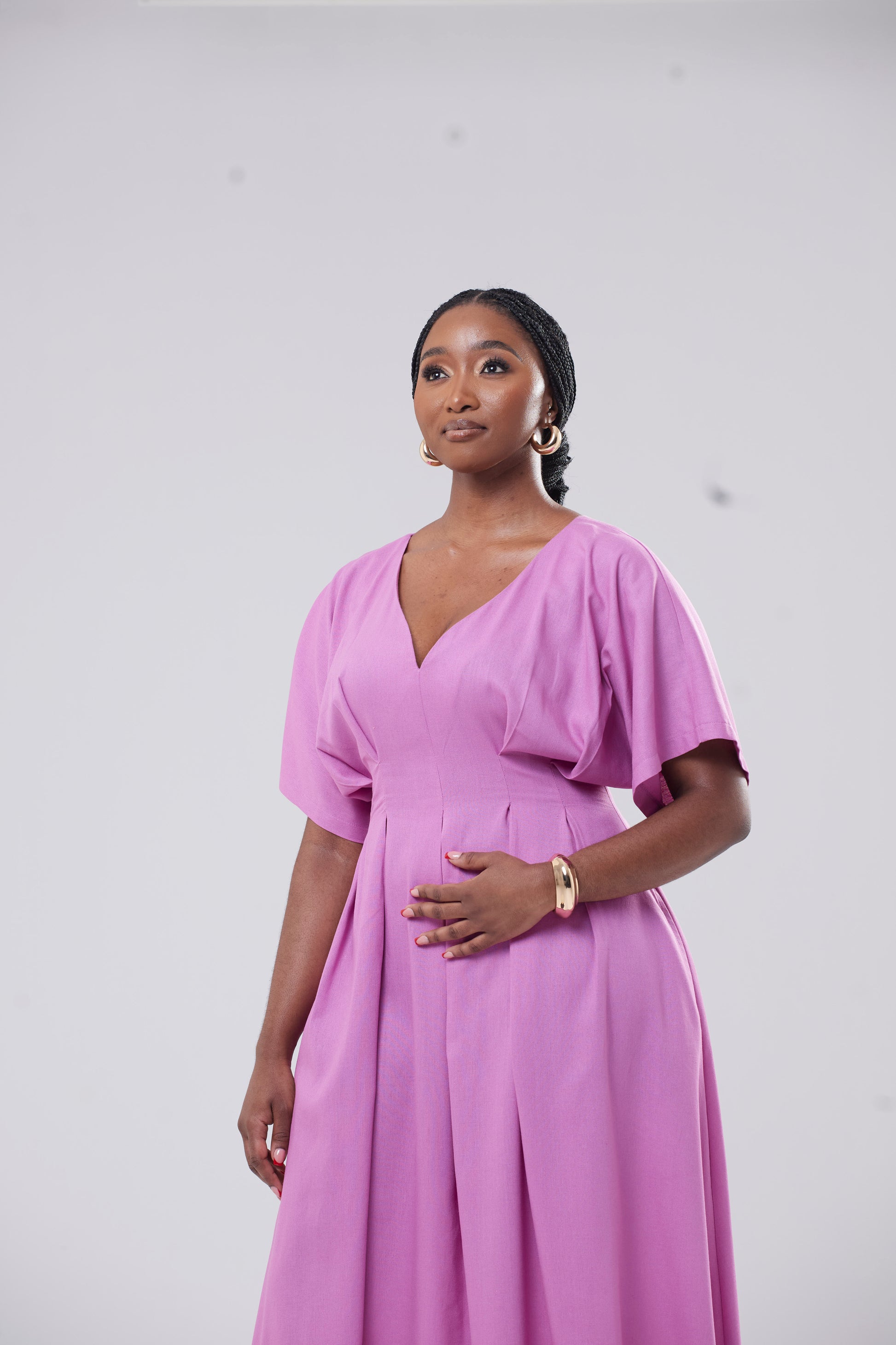 Elevate your wardrobe with the Zekhethelo Dress. Its thick, luxurious poplin fabric and waist pleats add a touch of sophistication. The midaxi length and convenient pockets make it perfect for the corporate girl on the go. Make a statement in this fuschia purple and exude elegance and exclusivity.