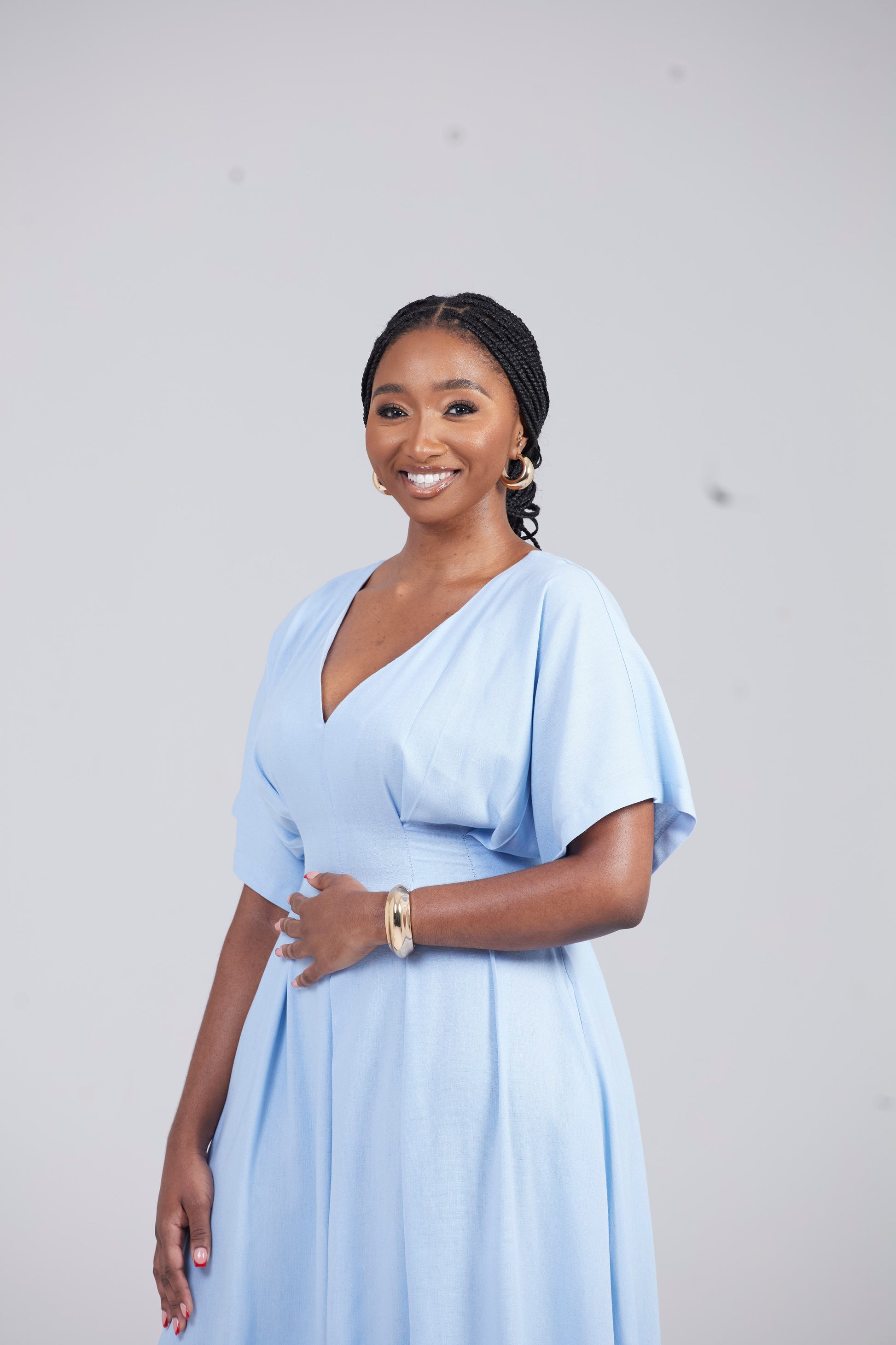 Elevate your wardrobe with the Zekhethelo Dress. Its thick, luxurious poplin fabric and waist pleats add a touch of sophistication. The midaxi length and convenient pockets make it perfect for the corporate girl on the go. Make a statement in this pale blue and exude elegance and exclusivity.